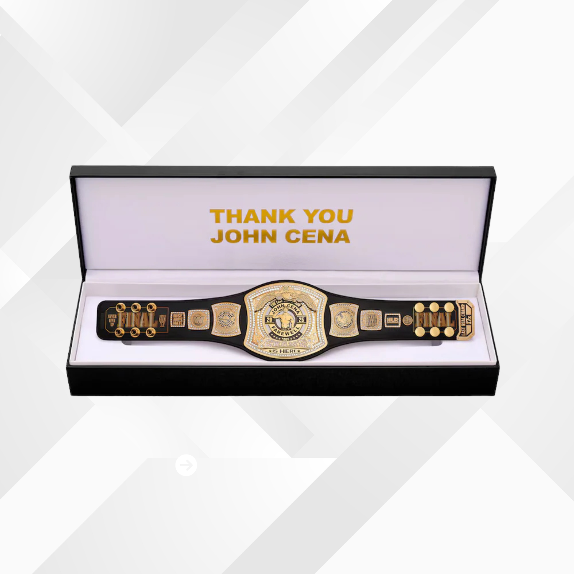 Celebrate the legacy of John Cena with the John Cena Limited-Edition Thank You Cena Mini Replica Spinner Championship Title Belt with Case. This collectible mini replica honors Cena’s legendary career and his unforgettable Farewell Tour capturing the essence of his time as a multi time champion.